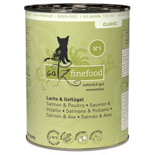 Witalność i zdrowie kota zależy zasadniczo od jedzenia, którym się żywi. Produkty catz finefood to dopasowane do potrzeb, zbilansowane i naturalne karmy dla kotów. Poszczególne receptury są wzorowane na naturalnym pożywieniu, dlatego zawierają najważniejsze substancje odżywcze i białka, które sama natura przewidziała dla kotów. Z tego powodu karma jest wolna od zbóż, będących ciężkostrawnym i nieprzyswajalnym składnikiem w kociej diecie.W karmie znajdują się wyłącznie najwyższej jakości mięso i wnętrzności z niemieckich gospodarstw rolnych oraz ryba z wolnych i zrównoważonych połowów. Cenne, świeże składniki po szczegółowym sprawdzeniu i kontroli weterynaryjnej wejdą w skład catz finefood. Zapewnia to maksymalna kontrola jakości i bezpieczeństwa. Podczas starannego gotowania na parze wszystkie substancje odżywcze oraz cenne kwasy tłuszczowe zostają niemal całkowicie zachowane. Produkcja karmy: wyłącznie w Niemczech.