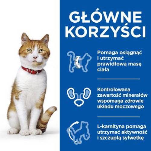 Niska zawartość tłuszczu i pełnia smaku: Hill's Science Plan Young Adult Sterilised z kaczką jest idealnym pożywieniem dla kotów, które muszą dbać o linie, a nie chcą rezygnować z przyjemności. Sucha karma została specjalnie stworzona dla młodych, wysterylizowanych lub wykastrowanych kotów w wieku od 6 miesięcy do 6 lat.Hill's Science Plan Young Adult Sterilised z pyszną kaczką zawiera mniej tłuszczu niż konwencjonalne karmy dla dorosłych kotów i dostarcza wysokiej jakości białka oraz inne ważne składniki mineralne i niezbędne substancje odżywcze. Zawartość minerałów ma na celu odciążenie dróg moczowych, aby utrzymać ich prawidłowe funkcjonowanie. Karma Hill's Science Plan ma zrównoważony skład i jest odpowiednia w codziennej diecie.