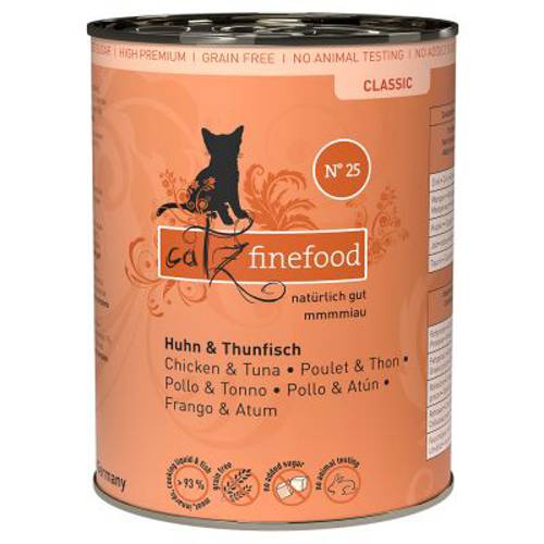Dopasowana do kocich potrzeb karma catz finefood w puszce bez glutenu , starannie przygotowywana, bogata w witaminy, z dużą ilością mięsa, 6 różnych smaków w miesznym pakiecie próbnym!