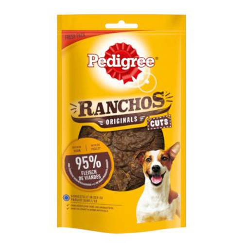 Pedigree Ranchos Original Cuts to odpowiedni przysmak dla Twojego psa. Smaczne kąski składają się w 95% z mięsa i produktów ubocznych pochodzenia zwierzęcego, co odpowiada naturalnym instynktom psa. Dzięki optymalnej wielkości kawałków przysmak przeznaczony jest dla psów wszystkich wielkości. Twój pies może wybrać między dwoma smakami: wołowiny i kurczaka, co zapewnia odmianę. Przysmak nie zawiera sztucznych barwników ani aromatów.Pedigree Ranchos Cuts w skrócie: