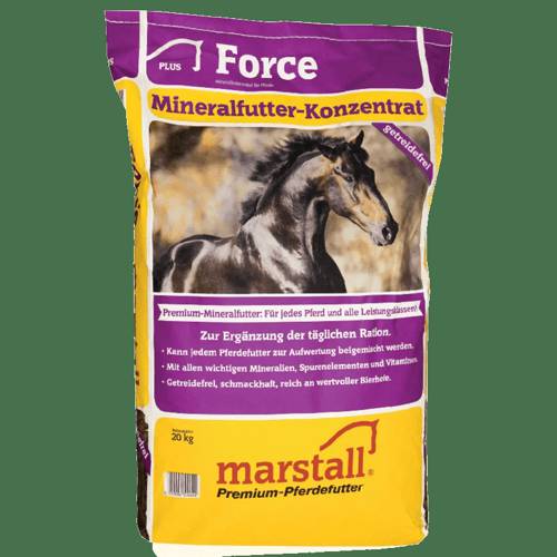 Suplement Force Marstall to kompletny preparat mineralno-witaminowy dla wszystkich koni - od rekreacyjnych po wyczynowe. Stanowi skoncentrowane źródło witamin, makro- i mikroelementów, aminokwasów oraz elektrolitów. Preparat Force stworzony w wygodnej formie aromatycznego i smacznego pelletu, chętnie zjadanego przez konie. Do podawania raz dziennie w niewielkich dawkach.